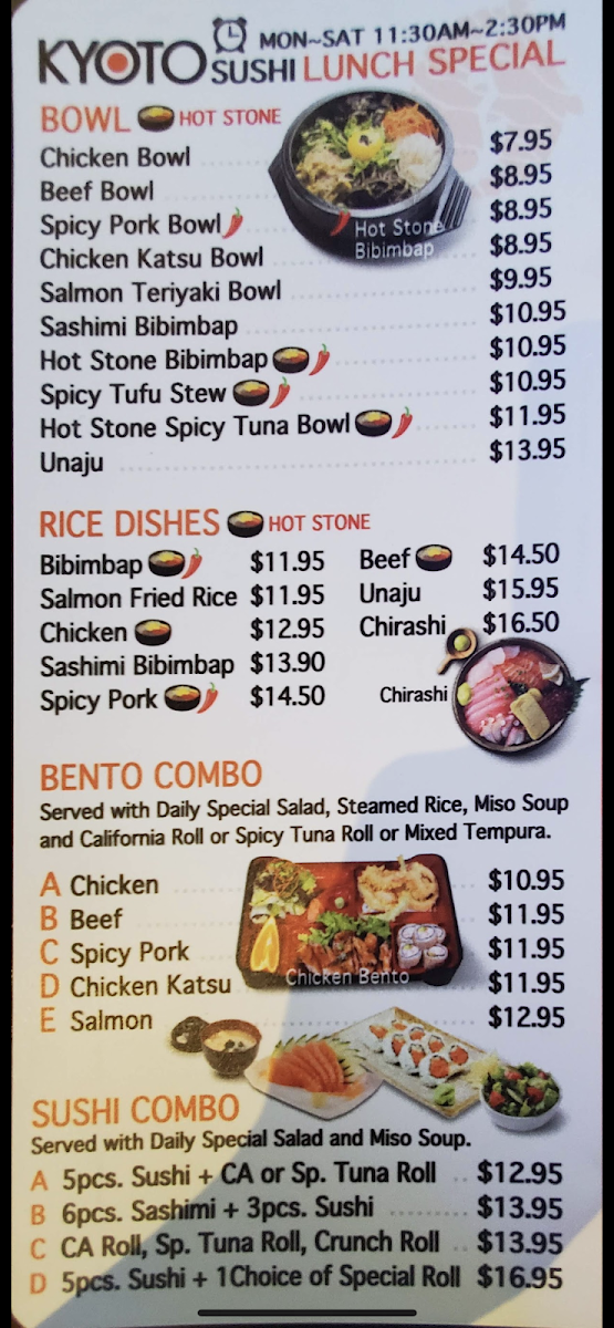 Introducing the menu at Kyoto Sushi - Ventura, located in the heart of Ventura, CA, is a delightful experience for sushi enthusiasts and novices alike. The menu is thoughtfully crafted, showcasing an array of appetizers like the flavorful Garlic Edamame and tender Shrimp Shumai, perfect for starting your meal. As you explore further, the Dinner Combos stand out, offering a satisfying mix of sashimi, sushi, and special rolls that promise culinary satisfaction.